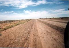 今日も6時半に起床してさっそくテントの撤収、荷物の整理を行う。水道のところに行くとバッタやコオロギが山のようにへばりついていた。地面には虫の死骸がいっぱい落ちているし・・・。ハエがいっぱい飛んでいるが、蚊よりはまし。 テントを撤収しているとサソリを発見。被害はなかったが、テントの中に入ってきていたらと考えると・・・。そしていつものメニューの朝食をとる。ハエを追い払いながら何とか食事を終え、後かたづけ。今日から先導バイクはPさんに変わりサポートカーをTさんが運転することになった。キャンプ場にいた犬とお別れをして8時頃に出発する。Pさんの走るペースはTさんより遅く100km/hくらいである。途中、写真を撮りながら走っていくが、周りはほとんどなにもなく、ひたすら360度地平線が続いていた。(いくら走ってもずっと地平線、日本では絶対にあり得ないことである)「BIRDSVILLE」に行くための曲がり角で休憩。気温が高く、のどがすぐ渇いてしまうためサポートカーの到着がすごく待ち遠しかった。蜃気楼のため遠くの山が浮いて見える。暑いわけだ・・・。 この曲がり角からダートコースになり、ひたすら地平線しか見えないところを走っていく。途中休憩したところの看板には銃で撃たれた跡が無数に残っていた。走りながらこの看板を撃っていったのだろう。(こわいこわい)さらに1時間ほど走ってやっと今日の昼食の場所「BEETOTA」に到着する。 昔は店があったようだが、今は建物だけが残っている。屋根とベンチがあるところに陣取り、みんなが到着するのを待つ。昼食はゆでたソーセージとコッペパンで作る自作のホットドックである。用意している間、どんどん増えてくるハエを殺そうとしていたが、きりがない。結局あきらめる・・・。むかつく〜〜!!(-_-X) ゆであがったソーセージをパンに挟み、ケチャップをかけてホットドックの完成。ハエがよってきて仕方がないので走りながら食べていた。ただ日差しが強いためむちゃくちゃ疲れてしまったが・・・。食事も終わり、支度を整えて出発する。 周りに見えるのはひたすら地平線・・・。1時間おきくらいに休憩をとりながらひたすら走っていく。いくら走っても周りの風景は変わらない・・・。(T^T) 休憩のたびに水分を補給しないとしゃれにならない。途中から道路の周りは砂の砂漠へと変わった。全部が砂というわけではないが、今までは岩の砂漠だったんでちょっと感じが違う。砂のところはきれいな砂紋も出来ていた。さらに1時間ぐらい走って今日のキャンプをする町「BIRDSVILLE」の入り口に到着する。 この町の入り口には競馬場があり、ここは一年に一回だけレースが行われるらしい。(BIRDSVILLE