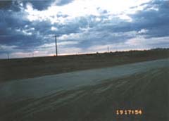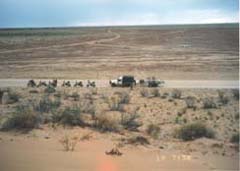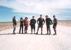 結局夜中に一度起きたせいか、あまり寝付けず、5時半には目が覚めてしまい、みんなが起きるまで近くを散歩する。テントを撤収していつもの朝食となる。Oさんは昨日のパブに帽子とフライネットを忘れてきたらしく、代わりにスカーフを顔に巻いて銀行強盗みたいな姿になっていた。ハエと格闘しながら後かたづけを終え、荷物を車に積み込む。今日もいきなりオフロードからの始まり。昨日までとはうって代わり、天気が悪く、ずっと曇っている。雨が降らないことを祈りつつ出発する。 しばらくは雨も降らず、熱くもなく順調だったが、途中からついに雨が降り出した。ただ、あまりひどくなかったのでカッパの上だけ羽織って走り続ける。100km位走ったところで休憩。昨日まではサポートカーが来ると我先にと水を飲んでいたが、今日はどちらかというと寒くて、あまり飲む必要はなかった。 止まったところのすぐ横が砂丘になっていたので登ってみることにした。砂山なので結構足を取られて上りにくいが、なんとか登りついた。晴れていればもっと眺めはよかっただろう・・・。この後は雨が降ったりやんだりの繰り返しだった。途中、全く建物もなく、人影も見えない。小さな分かれ道がいっぱいあったので途中で間違えたんじゃないかと心配になったほどである。そして130km位走ったところでやっと休憩。進む方向は空がさらにどんよりしている。かなりの距離を走ったため、さすがにサポートカーはなかなか現れない。サポートカーが来るまでしばらく休憩となった。 まだ雨は大丈夫だろうと思ってカッパを着ずに走っていたが、出発してすぐに雨がひどくなってきた。あわててバイクを止めカッパのズボンとブーツカバーを着る。そのまましばらく走ると、なにもなかった地平線に岩山が現れ始めた。そしてやっと今日の昼食をとる「MUNGERANIE」に到着する。 建物はパブが一軒あるだけで他にはなにもない。今日の昼食のメニューはステーキのサンドイッチ。かなりの量があり、味もとても良かった。さすがに大きいため食べても食べてもなかなかなくならない・・・。(^^;;天井を見ると酔っぱらいからせしめたという帽子がいっぱいぶら下がっていた。飯を食べ終えてくつろいでいると、店のおっちゃんが鞭を持ってきた。羊や馬の誘導に使う鞭で、うまく操ると音が出る。のであるが、まねをしてやっても全然うまくいかず、全然音が出ない。鞭の先が自分に飛んできてあたって痛い・・・。(T^T) 最後は何とか音がでるようにはなったが、おっちゃんがやったときほど大きな音は出ない。さんざんむちを振るった後、疲れて店の中に戻る。 店の人たちが見送られて出発しようとすると、急に雨が降ってきたので、あわててカッパを着ることになった。途中から天気も徐々に回復してきて晴れ間も見えてきた。約100km走ったあたりで休憩をとる。このころには天気も完全に回復してきたので、カッパを脱いで走っていくことにした。しばらく走っていくと途中でAさん、Nさん、Oさんが止まって、手招きをしている。みんなで写真を撮っていなかったので、ここで撮ろうと思い、待っていたらしい。ただしPさんとJさんは先に行っているのでM君とサポートカーの到着を待って写真撮影をする。 途中の道路脇でみんなが止まっていたので同じようにバイクを止める。道路の脇の高台を見て「あそこをバイクで登るんじゃない?」とか冗談で言っていたら、本当に登るらしい。マジか・・・。(@_@)確かによく見てみると道らしきものはあるが・・・。まずはPさんが登り、続いてAさん、Oさん、Nさんと登っていく。次に自分が挑戦したが、最後でスロットルをゆるめてしまい、見事に転倒・・・。(あーあ・・・) バイク自体に大きな被害はなく、若干クラッチレバーが曲がった程度ですんだが。最後にM君は無事に登ってきた。 次に降りなければならないのだが、上から見るとさらに急な斜面に見える。しかし降りないとどうしようもないし・・・。登った順番で今度は斜面を下りていく。自分も勇気を振り絞り一気に下りる。今度は無事に下りることができた。 道路に戻って少し休憩した後、キャンプ地に向かって出発する。こけたときにクラッチが曲がってしまい、ガード部分に当たって操作しづらいが、何とかだましだまし走る。さらにミラーのねじがゆるんだのか、風圧で曲がってくる。何度か戻しているとなんと付け根からおれてしまった。仕方がないのでこのまま走り、「MARREE」と言う町に到着した。 さっそく荷物を下ろしてテントの設営に取りかかる。さすがにみんな慣れてきたせいかかなり手際がよくなっていた。組分けの結果、今日はNさんと一緒のテントである。今日はキャンプ場に洗濯機があるということでさっそく洗濯に向かう。洗濯している間、ビールを飲んだり、シャワーを浴びたりして終わるのを待つ。ここの乾燥機はなぜかすぐにブレーカーが落ちてしまうため、結局横にあった物干し台に干す