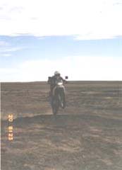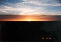 朝6時半に起床したが、旅行になれてきたせいか完全に熟睡していたようである。太陽が昇る方向は一本の地平線があるだけ。みんな写真を撮ろうとカメラを構えているがなかなか日が昇ってこない。Tさんが食事ができたと言ってきたが、とりあえず日が昇るまでみんなそこで待っていた。そしてやっと日が昇り始め、写真を撮ることができた。そしていつもと同じメニューの朝食をとる。相変わらず朝はハエがいっぱいいるが、さすがにある程度慣れてきた。食事の後はいつも通り後片づけ。昨日干しておいた洗濯物を取り込み、出発の準備を整える。昨日壊してしまったクラッチやミラーはちゃんと修理が終わっていた。 この町に置いてあった大陸横断鉄道を走っていた列車を見に行くが、屋外に展示してあるせいか錆まくっていた。部品などは当時のままみたいで全然取り外したりしていないようだった。空を見上げると雲がうっすらとかかっているため、あまり暑くもないが、風がかなり強い。しかし逆にバイクが巻き上げる土煙がすぐとばされるため、間隔をあまりあけなくても走ることができた。80kmくらい走ったところで「LAKE EYES SOUTH」という塩湖のそばにやってくる。 残念ながら泥にはまって動けなくなると言うことで、バイクであまり近くまでは行くことができないらしい。途中から自分を含めて5人でバイクで行くことになった。泥が深くなる手前までバイクで行き、そこから歩いて塩湖へと向かった。 後ろからAさんも付いてきていたが、途中で引き返したみたいで結局自分一人で歩いていった。しかし歩いても歩いても塩湖までたどり着かないし、途中から泥が深くなって歩きにくくなる。やっと地面が塩になっているところに到着。ここまで500m位あっただろうか?厚さ1、2cm位でえんえんと塩の層が続いている。塩湖の中心あたりはもっと層が厚いのかもしれないが、さすがにそこまでは行く気が起きない。みんなはもう車のところまで戻っていた。薄情だなあ・・・(^^;; 戻って休憩しているとPさんとAさんがバイクでジャンプに挑戦。うーむ、自分には出来ない・・・。そこから少し行ってエアーズロックまで延びていた鉄道の駅跡に到着する。もう半分以上崩れていてぼろぼろだった。言われてみてみると確かに道路に沿って盛り土がしてあり、線路の跡が続いていた。ただレール部分は撤去されており、枕木だけが残っていた。なにやら地下室みたいなものがあったが、なんか出てきそうで怖い・・・。 さらに進み、「BUBBLER SPRINGS」という泉が湧いているところに寄る。こんな砂漠の真ん中にも泉がわいているんだ・・・。小さな川があり、その上流に地面から湧く泉があった。川には小さな魚の姿も見える。この泉、正確には温泉だろう。少し暖かく、しょっぱい水であった。日本であればここで入って行くところだろうが・・・。 この後、途中でエアーズロックのキャンプ場で行うキャンプファイヤー用の薪として、近くの線路跡の枕木を持っていくことになった。適当に3つばかり選びトラックに乗せる。毎年持っていっているのだろうか? 眼下に塩湖が広がる眺めがよい高台で休憩。ただ高台のためさらに風が強い。Nさんのカメラで全員の集合写真を撮った。(この写真が唯一の全員の写真となった)その後やっと今日の昼食の場所である「WILLIAM