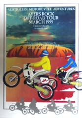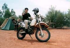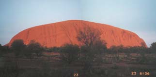 今日は朝日を見に行くため朝5時に起床。いつもと同じメニューの朝食を取っていると突然出発しようと言われ、あわてて出発する。すぐ出発するのなら先に言ってくれていればいいのに・・・。まだ暗い中を走っていき、サンライズポイントへ。そこにはもうかなりの人が集まっていて、道路脇にはいっぱいバスや車が止まっていた。エアーズロックまでの距離が近すぎるため、自分のカメラでは全体が入らない。広角レンズがほしかった・・・。日が昇ってくるとエアーズロックが赤く色づいてきた。結局、1枚には入らないので2枚に分けて撮らないといけなかった。 エアーズロックの登山口に行くともうすでに多くの人が登り始めており、長い人の列ができていた。暑くなるだろうと思ってショートパンツに履き替え、上のトレーナーも脱ぐ。鎖があるところは人が連なっていて走って上れないため、その脇を四つん這いで登っていく。しかし最初の斜面の半分くらいの高さまで登ったあたりで気分が悪くなりダウンする。どうやら日頃の運動不足にくわえ、急激な運動で酸欠状態になったようである。結局、回復するまで山の斜面にねっころがっていた。一気に登ってきたが、半分死んでいる間にみんなに抜かれてしまった。何とか回復して再び登山を開始する。今度はゆっくりとほかの人たちと同じペースで登っていった。鎖のなくなるところまで登って少し休憩をとる。この時点で距離では1/3、高さでは2/3登ったことになる。ここまではほんとに気を抜くと下まで一気に転がり落ちてしまうような斜面である。風がかなり強く、陽がまだ登っていないため、結構寒い・・・。 ここからは鎖はなく、道しるべに地面に白い点線がかかれている。この先には大きな斜面はないが、深い溝がずっと走っていて急な斜面を降りたり登ったりの繰り返しだった。斜面は60度以上あるところもあり、結構怖いところである。ひたすらアップダウンを繰り返しながら、ついにエアーズロックで一番高いところに到着する。結局、50分くらいかかってしまった。周りはすべて地平線でほとんど起伏がない。このずっと向こうの地平線から自分たちは走ってきたんだなあ・・・。しばらく休憩をとった後、下山を開始する。風が強いこともあり、Tさんは帽子を、Yさんはサングラスを落としてしまった。途中から登山コースを外れて、とばされた方を探しに行ったが、結局見つからなかった。おそらく斜面の途中で引っかかっているのだろう。そのまま下ってバイクのところに戻り、みんなが降りてくるのを待つ。 みんなが集合するのを待って、昨日ちょっと入り口まで行った「Maggie Springs」に行く。ここの奥の洞穴にアボリジニーの描いたと言われる壁画が残っていた。壁画は全部で3カ所あったが、最後に見たもの以外はどこがなんの絵なのかよく分からなかった。 続いて約50kmはなれたオルガ渓谷へと向かう。途中でオルガの全景が見渡せる展望台へと行く。この展望台はオルガ渓谷の全景を見渡すことができるところで眺めは最高にいい。が、ハエがえらく多いのはつらかった。写真をとってさっさと出発する。オルガ渓谷に付くが、サポートカーが別行動だったため、メットを持っていかなければならない。(このメットが結構じゃまだった)ここにもハエも山のようにいるが、フライネットは持ってきていないためジャケットを振り回したりして追い払いながら歩くことに・・・。両側は高い岸壁となっており、所々、岩がえぐれ落ちている。落ちた岩は下に転がっているが、その一つ一つはかなりの大きさである。さらに進んでいき、やっとこの渓谷の一番奥へ到着する。(一番奥と入っても道の一番奥ということで渓谷の終点までは行くことができない)結構な距離を歩いたので、さすがに疲れてここでしばらく休憩をとる。 駐車場に戻ってから、昼食をとるため近くの休憩所へと行く。今日の昼食は以前と同じく、ホットドックである。ソーセージをゆでて自家製のホットドックを食べる。この後、風の谷に行くが、駐車場の入り口で写真を撮ってすぐに出発となった。ちなみにここはナウシカに出てくる風の谷のモデルになったところである。 後はキャンプ場に戻るだけだったので暑かったこともあり、ジャケットを脱いでTシャツで走る。たかだか30分くらいだけだったが、腕が真っ赤になってしまった。思ったよりも日差しがきついようである。(ここの日差しを甘く見てはいかんな・・・)キャンプ場に戻ると、Pさん達のテントがアリだらけ・・・。カバンの中にまで入り込んでいるようだった。自分たちのテントは昨晩の虫除けが効いていたのか被害はなかった。(^^;; この後は時間まで自由時間と言うことで、買い物に行くことにした。戻ったらバイクをサポートカーに積んでしまうため、自分のバイクと記念写真を撮ることにした。 みんなそろったところでエアーズロックリゾートに買い物に行く。よく道がわからず、いろいろと道