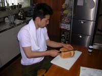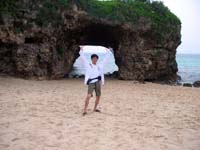 ふと目が覚めると7時になっていた。夕べ飲みにいったもう一人の男性はベッドにその姿が確認できない。もしかしてまだ飲んでいるのか?(?_?) なんかすごいねえ。しばらくするとなかのさんも起きてきた。 パンが焼き上がったようなのでさっそく開けてみると綺麗に焼けているみたい。おおっ!いい感じだ。さっそくパンを取り出すが、まだ熱くてふかふかなのでなかなか切るのが難しい。かなり強引に切るしかないのでちょっとつぶれてしまうんだがしょうがない。さすがに焼きたてのパンはおいしいねえ。(^o^)女性二人はダイビングに行くようで朝から準備をしていた。受付の書類を持っているんだが、なんか見たような紫色のファイルケース・・・。「もしかしてSun Islandですか?」と聞いてみるとほんとにその通りだった。しばらくこのダイビングショップの話。8時になってこずえさんが二人を迎えにやってきた。 なかのさんと話をして今日も天気が悪いようなんだが、せっかくだから車を借りて観光しようということになる。途中で宮古上布の織物体験にも行ってみよう。自分が今借りている車をそのまま継続してもいいんだが、小さなクラスがあればそっちの方が安くていいのでレンタカー屋に確認。一番下のクラスはないが、ナビが付いていないものがあるようなのでそれを抑える。これで1000円安くなるな。なかのさんと一緒にレンタカー屋へ向かい、新たになかのさんに車を借りてもらう。 宿に戻ると他のメンバーもぼちぼち起きてきていた。もう一人の男性は宿に戻ってきておりベッドで爆睡している。(あとで聞いたところ、夜中まで飲んで帰ろうとしたが、完全に足が動かなくなってしまったため、お店で寝かせてもらっていたらしい)宮古新聞を読むと、今日からマンゴーの出荷が始まったと書かれているが、ほとんどが本土に向かうので市場にはほとんど出回らないようだ。しかし今日から出荷と言うことは、土産屋とかで売っていたのは全部輸入物か何かなのかな?(?_?) なんだかなぁ・・・という感じ。 なかのさんに宮古上布の織物体験を確認してもらうと、いまからでも大丈夫ということなのですぐに出発することにする。準備をしてから今日の昼のフェリーで那覇に向かうしょうこさん、みきさん、ゆきさんにお別れを言って出発。(9時15分) まずは街中を抜けて県道83号線を進んでいく。砂山ビーチはまた後で寄る事にしてまずは北上して西原織物を目指す。ガイドブックを頼りに脇道に入っていくと、「西原織物」の看板を発見。しかしなんか普通の家みたいなんだけど、ここで体験ができるのか?店に入って聞いてみると、工房は別の場所のようだ。来た道を戻り、脇道に入る直前の所に工房を発見。が、なんかかなり小さいし、古い・・・。(9時半) 建物の前で待っていると先ほどのお店の人がやってきて中に案内される。部屋には機織り機が3台あり、一つはすでに女性が座って作業をしていた。奥で作業をしている人のは結構大きなものだが、自分たちが使うの体験用のものは横幅が半分くらい(30cm)のものである。まあ、体験用なのでこんなものなのかな。 糸の準備をして貰ってからまずはなかのさんからスタート。(9時40分)縦糸はすでに決まった色合いのものが張られているので、模様は横糸で使う白と緑の二色で変化させるしかない。自分でデザインを考えながら織っていくんだが、思ったよりもペースが速い。どうも織物の目がかなり粗いし、糸も太いようなのでこんなペースなのかな?1時間程で50cmくらい織って終了。 続いて自分の番となるが、なかなか難しい・・・。模様を考えながら織っているとなんか縦糸が変な感じ・・・と思ったら切れてるやん!!(ToT)なかのさんは一回も切れなかったのにねえ。修理して貰ってから再び織り始めるがまたまた切れてしまった。なんかよく切れるなあ・・・。もう一回切れてしまった後は順調に進み、1時間程で40cmくらいの長さとなる。(11時半)まあこんなものかな。織った部分をカットして貰ってからお茶をご馳走になる。しばらく話をしてから料金(一人3000円)を払って建物を出る。(11時45分)すると、「これでお昼でも食べなさい」と1000円返してくれた。ありがたいねえ。(^o^)(後で考えると一人2時間で3000円だったように思うから二人で3000円でも良かったのかもしれないなあ(?_?)) とりあえず北上して池間島の方まで行ってみようと言う事で県道83号線を北上。朝はまだ明るかったんだが、徐々にどんよりしてきて今にも雨が降りそうになってきた。うーむ、大丈夫かなあ?(ToT)そろそろお腹も空いてきたのでどこかで食事をしたいところなんだが、さてどこで食べるか・・・。案内を見ると、この道沿いに何件かお店があるんだが、なんかイメージが違う感じ・・・。このさきにタコ入りの料理が有名と書かれているお店・すむばりがあったのでここに寄っていく事にする。外観はあまり綺麗な感じではないが、さて、どんな感じの所かなあ? 店の中は外観に比べ