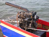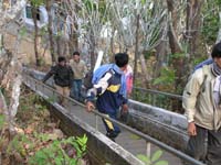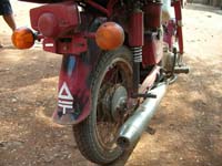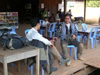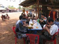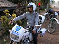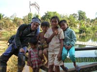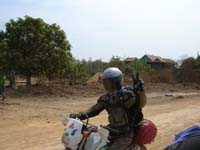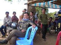 携帯のアラームが鳴ったのでもう6時かと目を覚ますが、「ごめん、日本で使っているアラームをそのままにしていた。まだ5時前。(T^T)」ということで再び眠りにつく。次に目が覚めると予定の6時。うえのさんは早々に準備を終え、近くへ散歩に向かったようだ。自分も荷物の整理を完了したところでバイクの所に行ってパッキング。シャントゥンとムニンは来ているが、ナットの姿はまだ見えない。 朝食はこのホテルの経営するすぐ横にあるレストランで食べるようだ。メニューはいろいろあるが、自分はインスタントヌードルを注文。佐々木さんはやっとおなかの調子が良くなってきたようで、オムレツを注文している。よかったねえ。(^o^)自分のやつはすぐに出てくると思ったんだが、なかなか持ってきてくれない。他の人の頼んだヌードルwithポークやオムレツなどはさっさと来るのになんでこないんだろう?遅れてやってきたナットが注文したものよりも後になってやっと持ってきた。(T^T) ほんとにインスタントヌードルなのになんでこんなに時間がかかったんだろう?怒った 味は今まで食べたものとあまり代わりはない。ミネラルウォーターをもらい、二本は飲料用にポカリスウェットに、もう一本は手を洗う為の水として確保。(食事の時とかに水がないとほこりだらけで大変なので、このあとは常にこのパターンで水を確保する) 食事を終えてから8時にここを出発してまずはガソリンスタンドへ。走行距離と給油量をみると130km/6.4Lなので燃費は20km/Lとかなり低い。まじでこんなに悪いのか?(?_?) しかし全員分の給油量と走行距離を考えると燃費は25km/L位になる。うーむ、自分のバイクの燃費が悪いだけなのかなあ?そんなにふかしている気はしないんだけどね。 まずは夕べ夕食をとった店に弁当をもらいにいくようだ。昨日は真っ暗の中を走っていたので、ちょっと違う感覚だ。この途中で前を走るシャントゥンがポリスと何か話しながら併走している。知り合いなのか?(?_?) 店に到着するとポリスも一緒に停車。ちゃんと仕事しろよ・・・。(^_^;; まあいいんだけどね。弁当を受け取るが、もちろん昨日と同じく入れるようなスペースはない。ロープにくくりつけているタオルをネット代わりにして縛り付ける。これでおそらく大丈夫と思うけど・・・。 ここからポリスに先導されて(仕事の一環なのか?)北上していくと、道も舗装路に変わる。途中のダートは単に工事中なのかなあ?「今日はこのまましばらく舗装路を走っていくのか?」と川に沿って走っていると、10kmくらい行ったところで脇道のダートへ。舗装路もここで終わりか。ポリスと別れて道を下っていくと、その先の山を登り始めた。そういえば山の上にある寺に行くと言っていたなあ・・・。山を一気に駆け上がり、境内にバイクを止める。(8時45分・11km) この山はサンボッマウンテンという名前で山の頂上にお寺が建っている。山には金鉱が通っているらしく、雨の後などには金が発見される事があるようだ。どの程度の金鉱なのかは知らないが、近くの農民が掘っているという話しもあるらしい。これは本格的に調査がされていないだけなのか、かなり小さな金鉱なのか・・・。(?_?) でも雨の後に金が発見されるというレベルならかなりのものと思うんだけどねえ。さらに上の建物まで行くため階段を登っていくが、この階段が結構ハードだ。(T^T) 上に登ると広大な大地とメコン川が見下ろす事が出来る。ここから見える大地は全てメコン川が造った大地であり、この広大な大地は言ってみれば三角州であるとの説明がある。「へぇ〜〜、すごいねえ。」と感心していたが、そしたらこの山はどうやって出来たんだろうと疑問がよぎる。大地が削られて出来たとしたらこんな形にはならないし、うーむ・・・。(?_?) 一通りの説明を聞いてから建物を見ながら山を下っていく。建物にはクメール語でなにやら書かれているが、もちろんよく分からないのは当たり前である。(^_^;; バイクを止めたところまで降りてから近くの建物の中を覗くとなにやら絵が描かれていた。「なんか地獄の表しているみたいだなあ」と思ったらホントにそうだった。やはり仏教なので思想は一緒なのかな?閻魔大王が判決をしているシーンや、嘘をついた人が舌を抜かれているシーン、浮気をした人が針の木(日本なら針の山だけどね)に登らされているシーンが描かれている。一通りの説明を受けたところで出発。(9時15分) 山を下ってからこのままダートを走っていくのかと思ったが、先ほどの舗装路に戻ってきた。そこから5kmくらい走ったところでドルフィン湾と言うところに到着。ここは淡水のイルカを見る事が出来るところらしい。駐車場にはいるとなんか見たような人が・・・さっきのポリスではないか。仕事しろよ・・・。(^_^;; (9時半・17km) ここは「湾」と名前が付いているが、もちろん海ではなくメコン川の一部である。川岸のベンチに行ってからしばらく水面を眺めていると・