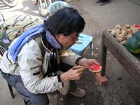 | 01 通学時間なのか自転車に乗った学生が一杯 02 シャントゥンの知り合い? 03 境内の中にある高台を登る みんなもうへろへろ(^_^;; 04 いるかは出てこないのかなあ? いるか湾で出現を待つ 05 かんさんスイカを食べる 06 ロータリーの付近を走行中(提供:佐々木さん) 07 フラットな道路を爆走中!走りながらの撮影 08 なにやら休憩所みたいな建物で一息 09 今日の昼食はここで (提供:佐々木さん) 10 郵便マークの付いたバイク 日本から流れてきたんだろう 11 地雷のマークを掲げたトラック 12 オアシスの付近にいた子供達と 13 佐々木さんとうえのさんはくつろぎモード 家の下には水が来ていて涼しい 14 スタントレンの町中を走る 15 ホテルの前のブランコでみんながやってくるのを待つ 16 こんな小さな舟にぎっちり・・・恐い恐い・・・(^_^;; 17 車のエンジンがそのまま乗っている 18 メコン川の夕暮れ 19 今日の夕食 |