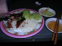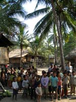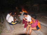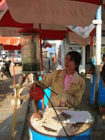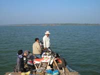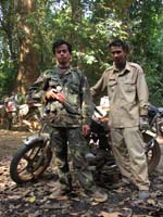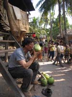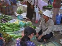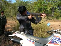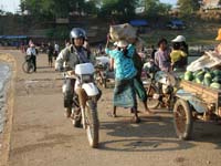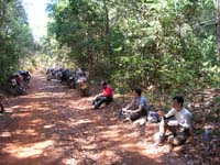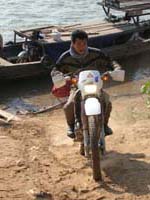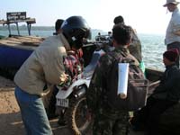 夜中に目が覚めて、「何時だろう?」と時計を確認すると0時を指している。「え?まだこんな時間か?」と思ったら時計が止まっているではないか。やっぱり来る前に電池が切れかかっていたんか・・・。(T^T) 携帯電話はシェムリアップに送っているので時間の確認はカメラでしかできないぞ。うーむ、やはり電池の交換をしておけば良かった。 再び眠りについて、次に目が覚めてから時間を確認するとまだ5時。出発まではまだ2時間もあるなあ。日記を書いてからデータのバックアップもすませて準備はひとまず完了。(6時)テラスに出てみると近くの市場の周りでは朝市が始まっているのか路上に物売りの姿が見える。あとでちょっと行ってみる事にしよう。服を着替えて準備が完了したところで、そうそうにロビーへ。(6時半)バイクのフレームが折れてしまったようだ。見てみると荷台の下の部分のフレームがぽっきりといっている。たしかにこれは恐いぞ・・・。 なんか他に見知らぬポリスと兵隊がいるんだが、先日のように何かの知り合いなんだろうか?話を聞くと、これから行く地域はゲリラなどの危険があるので警察に同行して貰うらしい。(@_@) シャントゥンは考古学研究かなにかの特別な免許(他の人に説明していたのをよこで適当に聞いていただけなのでよく覚えていない)を持っているので、無料で警察に警護を依頼する事が出来るようだ。一人は迷彩服を着ていたので兵士かと思ったんだが、二人ともポリスのようだ。ポリスの格好をしているのがアランホンタン、迷彩服を着ているのがサイという名前らしい。サイはかなり年季の入った銃を肩から提げている。この格好でバイクに乗るのかな?バイクは今から渡る川の対岸に置いてきているらしい。 まずはいつものように近くのレストランへ朝食へ。メニューはいつものような感じでライスかヌードルのようだ。自分は今日はライスwithポークを注文。かんさんはあまり食欲がないのでヌードルだけを注文したんだが、ホントに何も入っていないただのヌードルが出てきた。(^_^;; 野菜くらいちょっと入っている事を期待していたようだ。ライスはちょっと味付けが濃いが、味は十分と言った感じだ。お腹も満足したところで弁当を貰って出発。(8時) まずは船着き場の近くにあるドラム缶の置いている所へ。どうやらここがガソリンスタンドのようだ。ドラム缶に直接手動式のポンプが取り付けられていて、これで給油をするみたいである。なかなか味があっていいねえ・・・。(^o^) ポンプでくみ上げると上のガラス容器にガソリンがたまり、5L計れるようになっており、5Lを越えた分はもう一本取り付けられた排出口からドラム缶に戻るようになっている。その後は1L単位の目盛りで判断するみたいだ。さすがにこんな給油は日本では見られないのでみんなで給油している姿を撮影する(佐々木さんはかなりの枚数を撮影していた)が、給油している女性は「何が面白いんだろう?」と言うような顔をしている。まあこっちでは普通の事なんだろうけどね。(^_^;;他のみんなは6Lくらいしか入らないのに自分のバイクの給油量は7L。うーむ、やはり自分のバイクだけ燃費が悪いみたいだなあ。最後のバイクでドラム缶が空になってしまい、もう一つのドラム缶から給油。こっちは黄色なので何で色が違うのかと思って聞いてみると、先に入れていた緑がハイオクで、黄色がレギュラーらしい。いつもハイオクを入れていたんだ・・・。給油を終えてから近くの船着き場へ。(8時15分) 船着き場は幅3mくらいの桟橋からなっており、その両側に多くの舟が泊まっている。多いと言っても10隻くらいなんだけどね。人々が行き交う中をバイクで乗り付ける姿はなかなか絵になる感じだなあ。出来れば自分の姿を撮りたいんだが、ちょっと難しいので後からやって来たかんさんと佐々木さんの写真で我慢しよう。 「さて、どの舟に乗せるんだろう?やはりあの大きな舟かなあ?」と思っていると、数人でバイクを抱えて小さな舟に積み始めた。(桟橋と船のへりは50cm位の段差があるのでほんとに抱えて積み込んでいる)え・・・まじでこの舟?(@_@) その舟は長さ12m、幅2mくらいの小さな屋形船のような木造船だ。こんな舟にバイクを8台も乗せられるのか?屋根も付いているのでバイクを沈み込ませながら船内(?)に運び込んでいく。うっわー、強引やなあ・・・。手伝おうにもそんなに場所が広いわけではないので手の出しようもないし・・・。まあ、せっかくなので撮影に徹しよう。15分くらい掛けて8台のバイクを積み込み完了。しかし降ろすのがもっと大変そうだなあ・・・。他にも車がそのまま積み込めるような舟もあるんだが、その舟は到着する場所が違うらしい。目的の所に行くにはこの舟しかないのでどうしようもないようだ。車で行く場合はかなり回り道していかないといけないのかなあ? 準備が出来たところで舟に乗り始めると舟が傾いてバイクが転倒しそうになる。危ないなぁ・・・。と